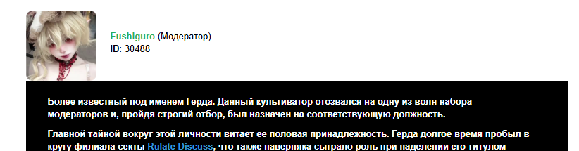 Более известный под именем Герда. Данный культиватор отозвался на одну из волн набора модераторов и, пройдя строгий отбор, был назначен на соответствующую должность.