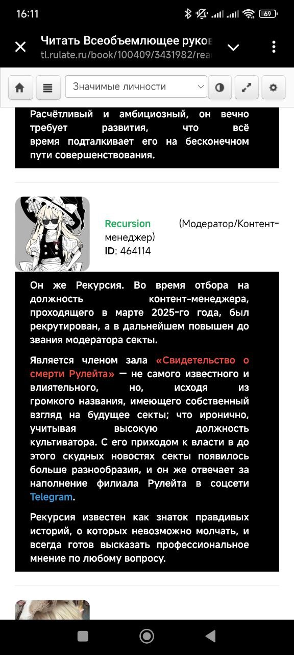 Он же Рекуршн, или Рекурсия — модератор, а также по совместительству летописец секты, составляющий информационные и развлекательные записи в филиале секты Rulate News.