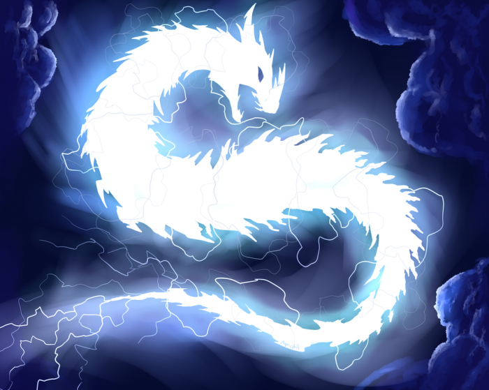 - М-му Бай! – Указали девочки со страхом вверх. Там, в грозовых облаках, огромный азиатский дракон, словно состоящий из молнии, извивался и яростно ревел, тогда как вокруг него летали семь едва заметных черных точек, которые на самом деле были людьми.