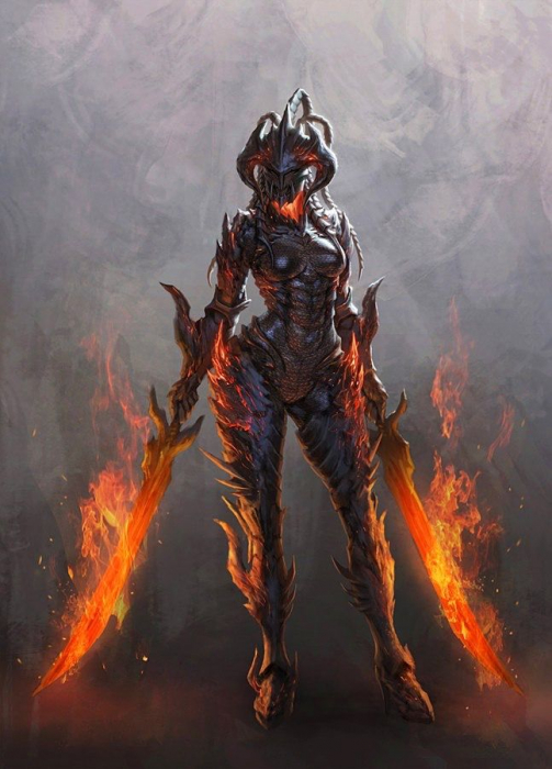 Тан Юэ же сейчас представляла нечто среднее между двумя предыдущими девушками. Она была облачена в средний доспех, будто состоящий из застывшей лавы, который плотно покрывал всё её тело. В руках же она держала два меча, раскалённых до красна и пышущих пламенем. Чёрные крылья за её спиной были перепончатыми, как у летучей мыши и имели оранжевые прожилки, напоминающие потёки лавы.