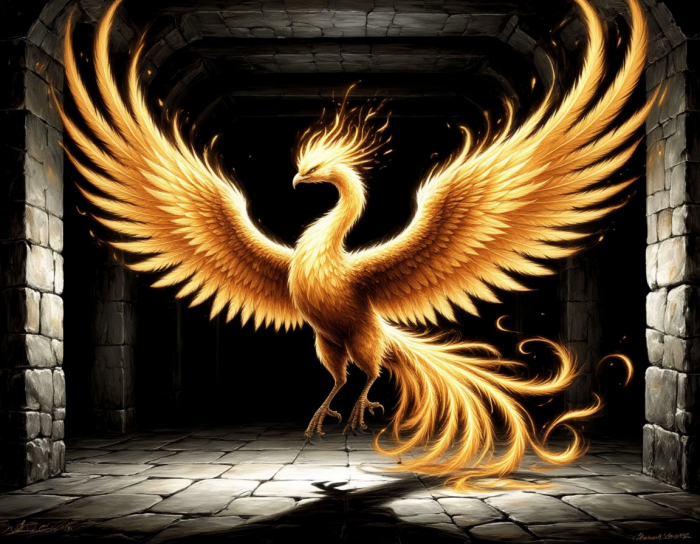 В воздухе вспыхнула искра света, и через мгновение перед ними появился знакомый золотой огонь, широко раскинув величественные крылья. Фоукс с яркими хвостовыми перьями, развевающимися за спиной, одним грациозным движением пронесся к ним.
