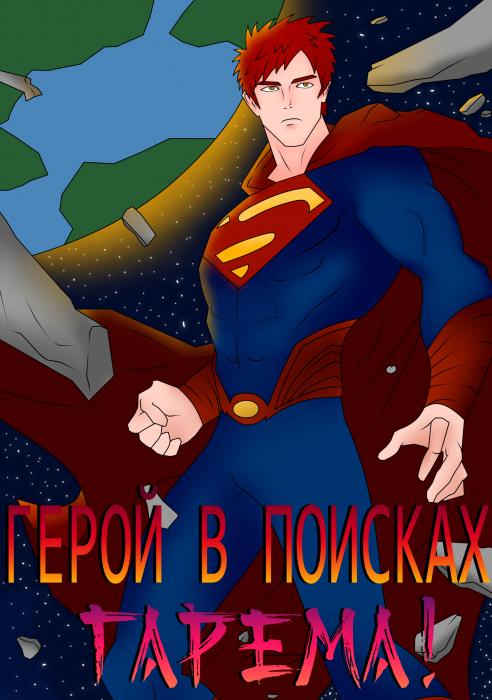 Тиля в форме Супермена, который летает в космосе на фоне планеты Земля... И эпичное название книги... ГЕРОЙ В ПОИСКАХ ГАРЕМА!!! У меня нет слов. Я просто рад это видеть. И всё тут.